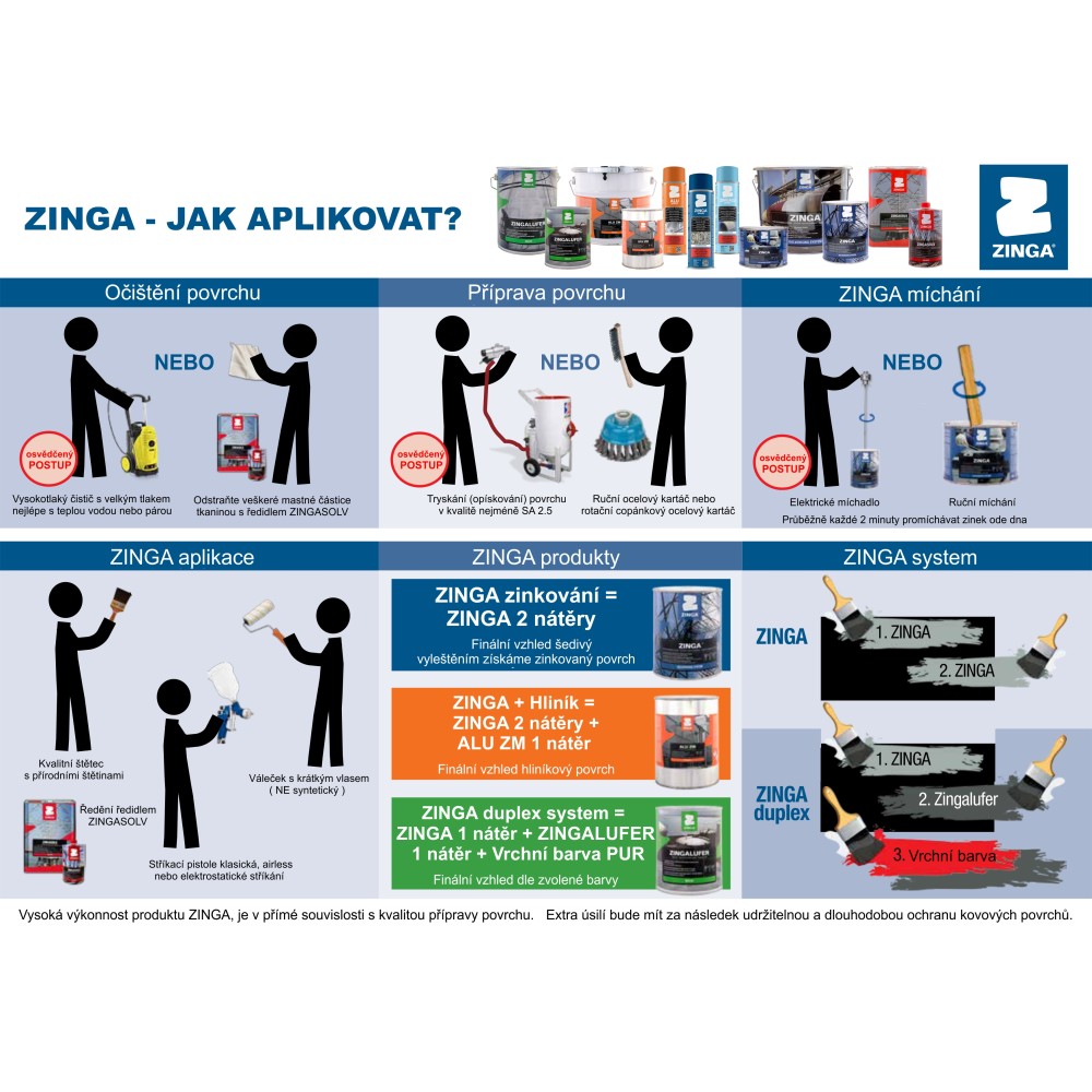 Nátěrová hmota ZINGA se používá jako primární nebo finální antikorozní ochrana ocelových konstrukcí. Dále se používá k opravám zkorodovaných nebo poškozených galvanizovaných a pozinkovaných ocelových součástí.