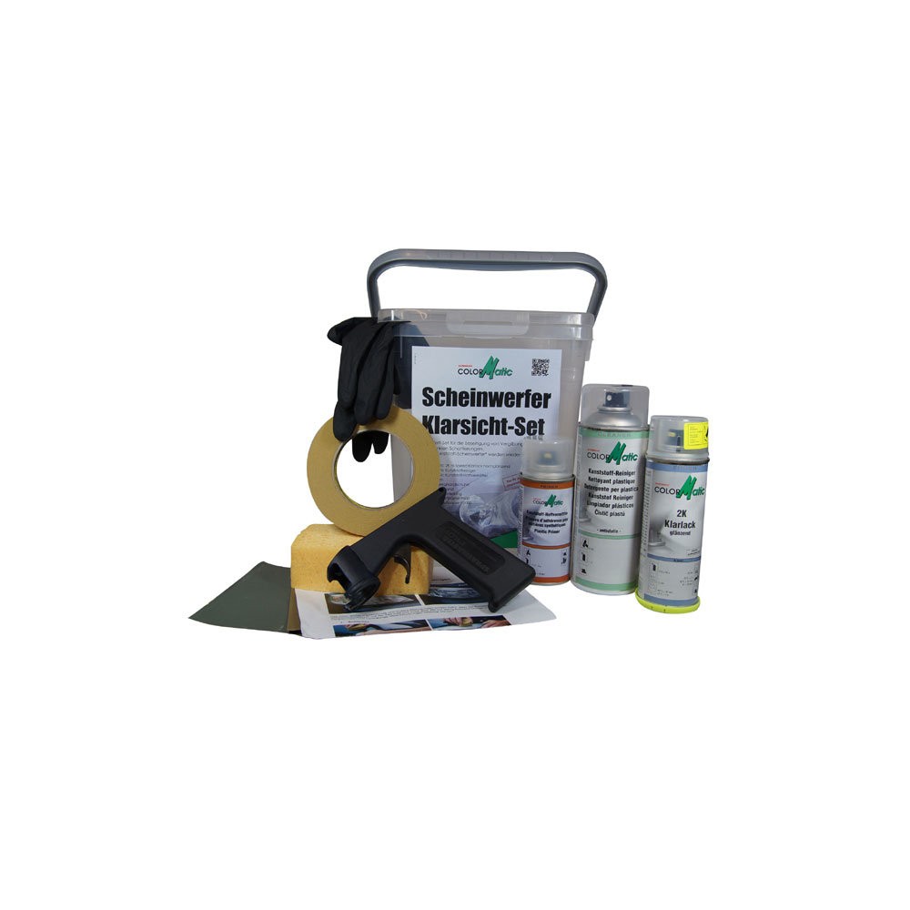 Kompletní sada pro renovaci rozptylových difuzérů světlometu z plastu pro přední a zadní světla. S ColorMatic sadou na opravu světlometů budou zažloutlé a zašedlé místa odstraněny velmi rychlé, díky snadnému a nákladově efektivní sadě. Renovace je možné provést v nedemontovaném stavu. Po broušení a čištění následuje aplikace pomocí přiloženého 2K bezbarvého laku, který obsahuje ochranu proti UV záření.