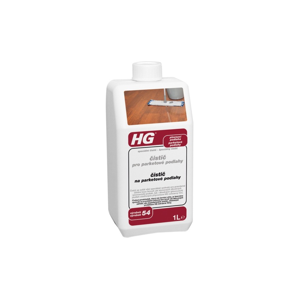 HG čistič pre parketové podlahy (špeciálny čistič) (HG výrobok 54) je mopový čistič s báječnou sviežou vôňou špeciálne vyvinutý na pravidelné čistenie bez šmúh ako lakovaných plávajúcich podláh, tak aj plávajúcich podláh ošetrených prípravkom HG ochranné filmy pre parkety (HG výrobok 51/52). Nalejte 100 ml (1 šálka) do vedra (5 l) s vlažnou vodou. Potom vytrite podlahu riadne vyžmýkaným mopom alebo handrou a pravidelne ich namáčajte v roztoku. Podlahu neoplachujte ani znova nevytierajte a nechajte ju uschnúť