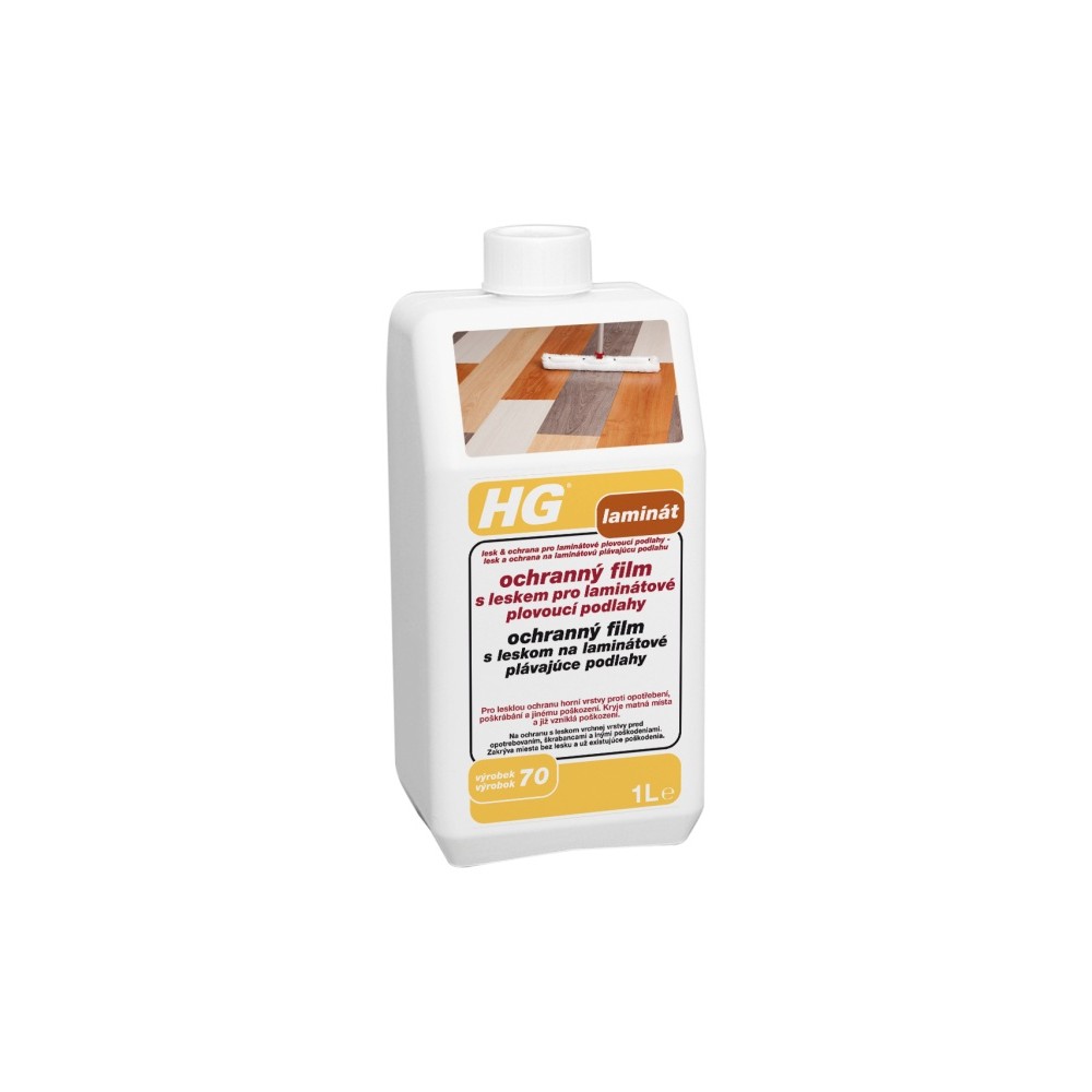 HG ochranný film s leskom pre laminátové plávajúce podlahy (lesk & ochrana pre laminátové plávajúce podlahy) (HG výrobok 70) je tekutá polymérová emulzia, ktorá sa ľahko nanáša a po zaschnutí vytvára lesklý a tenký, ale veľmi pevný ochranný film, ktorý chráni hornú vrstvu proti opotrebovaniu. Tento výrobok zároveň kryje matné miesta a už vzniknuté poškodenia a poskytuje protišmykový účinok. Nalejte na podlahu malé množstvo neriedeného prípravku a naneste ho rovnomerne v tenkej vrstve jedným smerom na podlahu leštičom na podlahy. Potom nechajte zaschnúť, potom môžete poprípade naniesť druhú vrstvu naprieč cez vrstvu prvú. 1 liter vystačí približne na 60 m2 na jednu vrstvu.