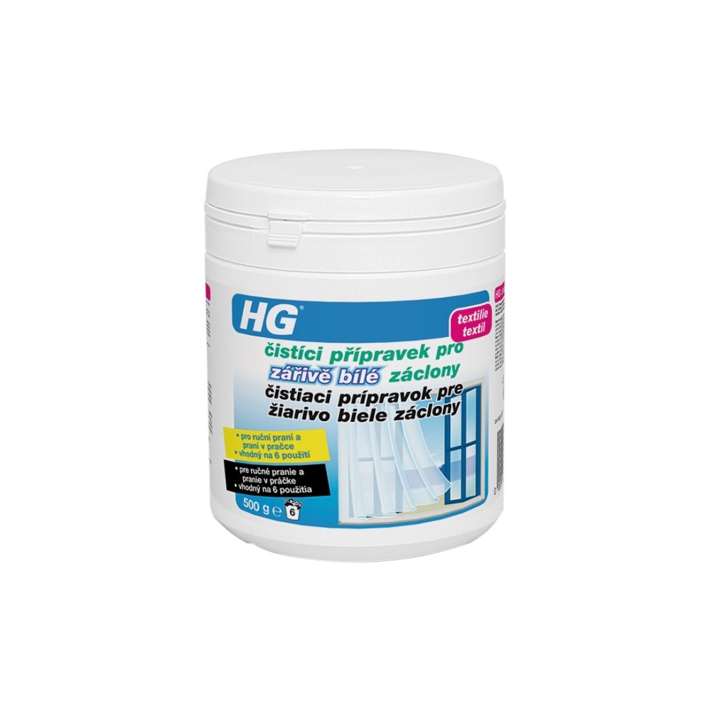 Záclona sa znečisťuje a šedne vplyvom prachu, dymu, usadenín z varenia a nikotínu. Pracie prostriedky HG na záclony bez problémov tieto nečistoty odstránia a záclony sú tak opäť žiarivo čisté a skvele svieže. Pre HG čistiaci prípravok pre žiarivo biele záclony použite vnútornú stranu uzáveru ako mierku. Pred použitím výrobku v práčke naplňte túto mierku až po značku 80 ml a prípravok vložte do priehradky pre hlavné pranie a spustite program prania na 30°C alebo 40°C. Po uplynutí programu prania môžete záclonu poprípade krátko vyžmýkať. Čistiaci prostriedok HG pre záclony je možné použiť aj na ručné pranie. Naplňte uzáver po značku 40 ml a prípravok rozpustite približne v 5 litroch vody. Väčšie záclony môžete vyprať napríklad aj vo vani. Uzáver naplňte dvakrát po značku 120 ml a prípravok rozpustite v 30 litroch vody. Potom nechajte záclonu odmočiť minimálne 2 hodiny. Pri odmáčaní záclonu občas otočte. Po uplynutí doby odmáčania vyberte záclonu z vody, ručne ju vyžmýkajte a potom ju 2krát vypláchajte v čistej vode. Pre maximálny výsledok pri praní v práčke aj pri ručnom praní nechajte záclonu odkvapkať, zaveste ju mokrú a zavesenú ju nechajte uschnúť. približne pre 6 praní v práčke alebo 12 ručných praní.