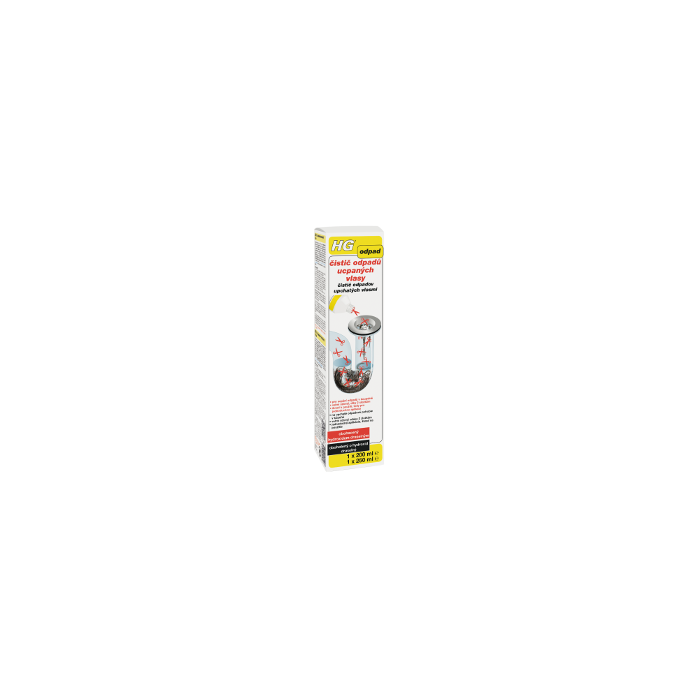 V koupelně jsou vlasy přícinou ucpání odtokových potrubí, umyvadla, sprchy i vany. Toto ucpání se ješte zhoršuje díky zbytkům mýdla, kožního tuku a zubní pasty, které na vlasech ulpívají. HG "čistič odpadů ucpaných vlasy" je obohacen hydroxidem draselným a díky tomu si rychle a účinně poradí s těmito vlasy, které zcela rozpustí, stejně jako i s dalšími materiály, které na vlasech ulpívají.