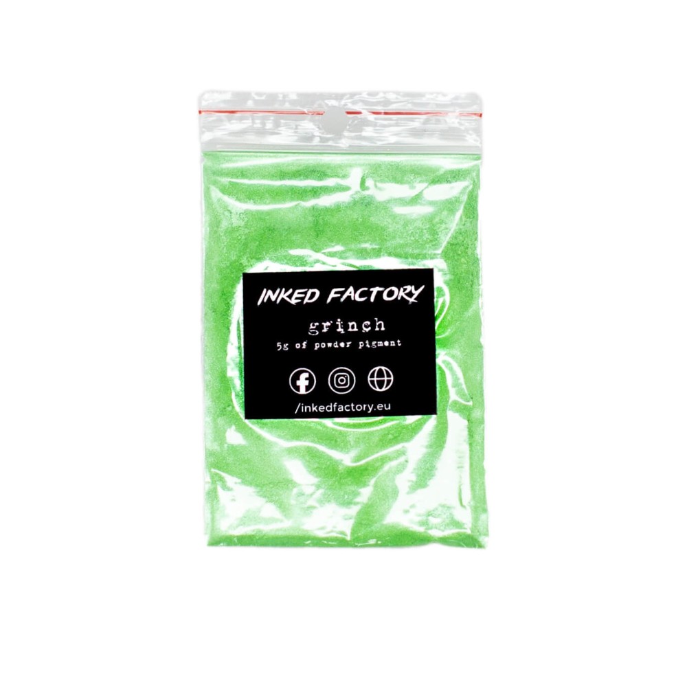 INKED FACTORY grinch je slídový pigment nejvyšší kvality, který je vhodný jak pro profesionální použití, tak pro domácí kutily. Nejčastěji je používán k probarvení epoxidových pryskyřic, své využití má i při 3D tisku z pryskyřice, u autolaků, plastidipu, při výrobě svíček, mýdel, koupelových bomb, slizů a mnoho dalšího. Vhodný je zejména pro materiály s čirou bází.