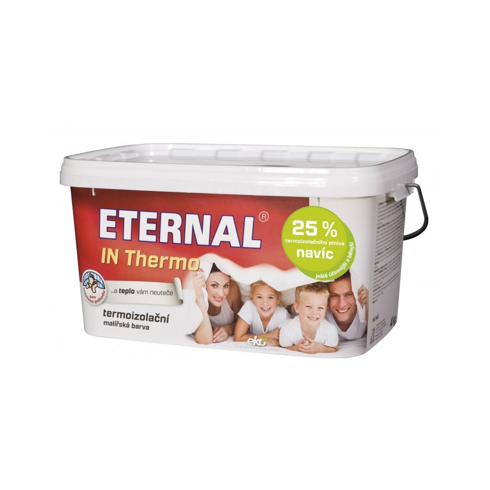 ETERNAL IN Thermo je vodou ředitelná nátěrová hmota připravená na bázi vodné disperze akrylátových kopolymerů, pigmentů, speciálního tepelně izolačního plniva a dalších plniv a speciálních aditiv. Nátěry provedené hmotou ETERNAL IN Thermo jsou omyvatelné paropropustné, vyznačují se vysokou kryvostí a tepelně izolačními vlastnostmi.