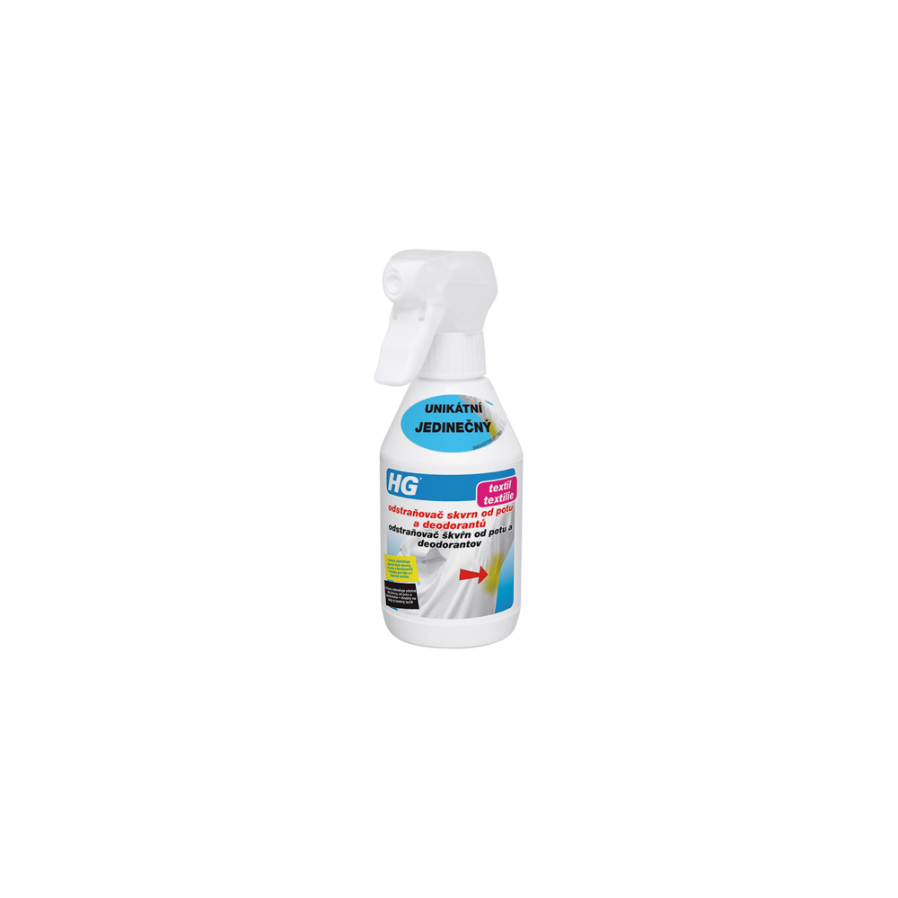 HG odstraňovač skvrn od potu a deodorantů je účinným přípravkem pro odstranění žlutých skvrn z textilu v důsledku potu nebo deodorantů. Tento typ žlutých skvrn nelze odstranit běžným pracím prostředkem nebo odstraňovačem skvrn, ale docílíte toho pomocí přípravku HG odstraňovač skvrn od potu a deodorantů.