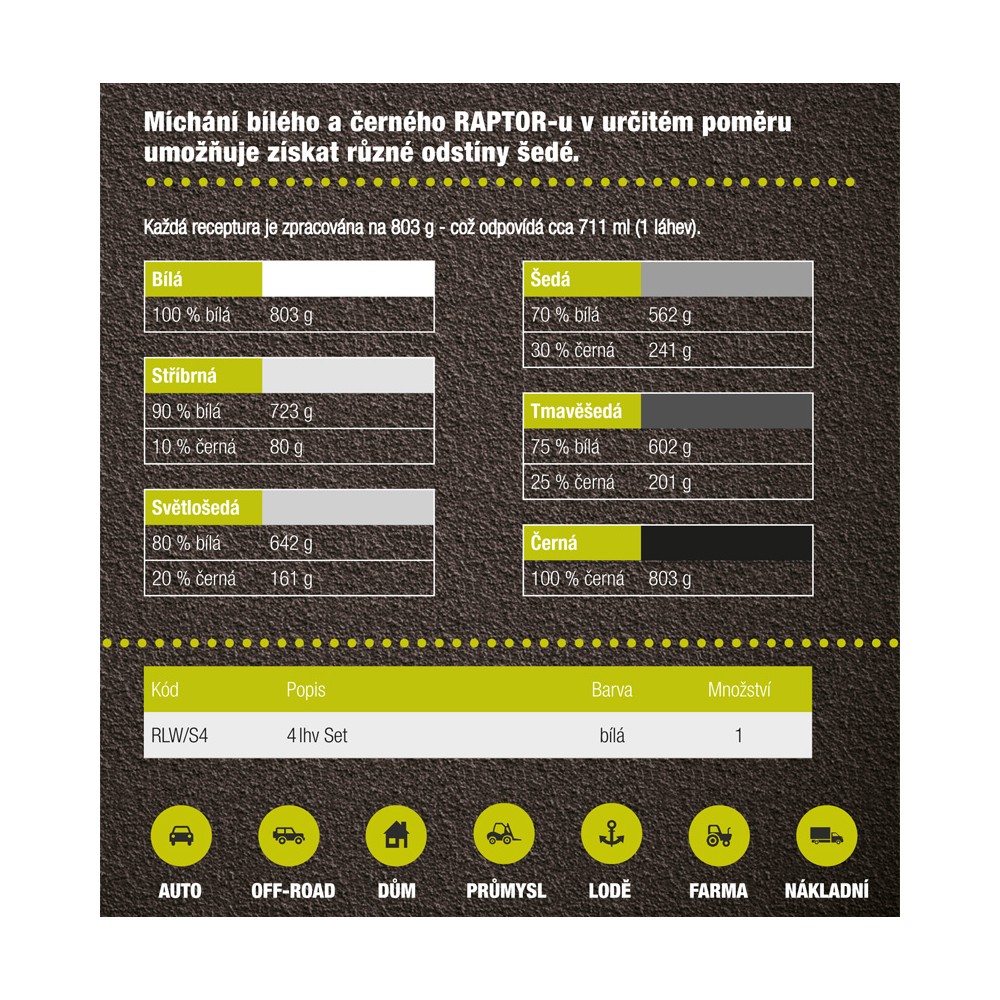 RAPTOR, tvrdý ochranný nátěr, je 2K polyuretanový lak určený pro všestranné použití na těžko namáhaných plochách. Např. ložné části nákladních automobilů, části karoserií, podvozky, lodě, průmyslové konstrukce, stavební a manipulační technika, zemědělská technika, vojenská technika, ...